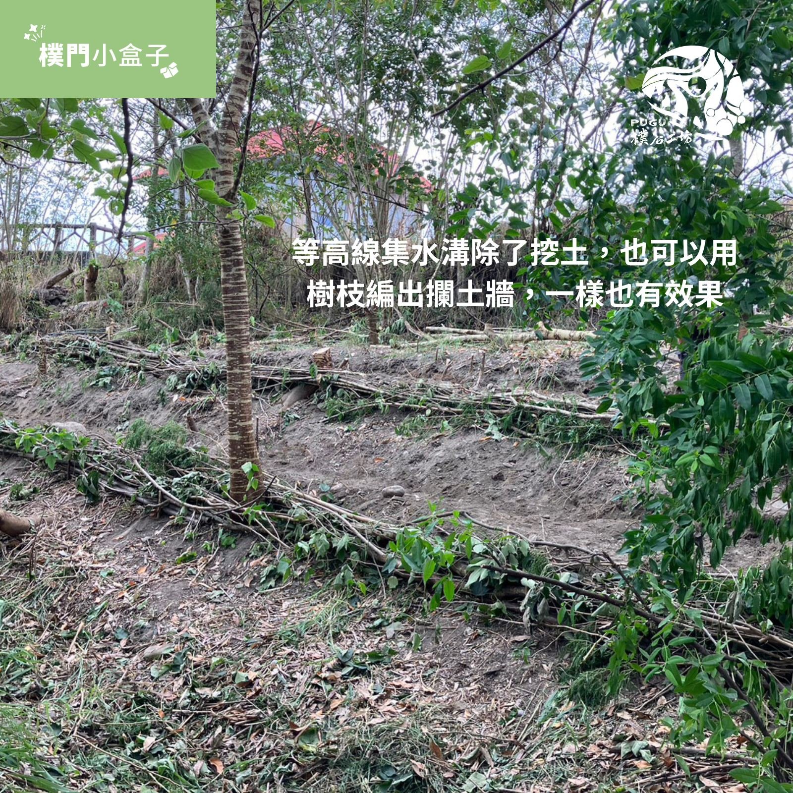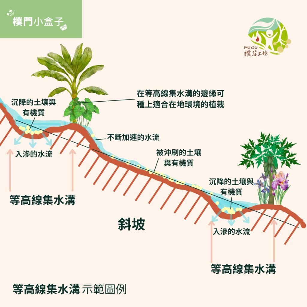 所以我們利用這個特性,沿著等高線開一條溝,所有的水流到這條等高線集水溝的時候,都會先停下來,這時候就有時間慢慢入滲到土壤裡,讓土壤先喝飽水,剩下的水才會繼續向下流。而如果我們沿著山坡做許多條等高線集水溝的話,那麼水基本上沒有機會造成侵蝕就又要停下來了。