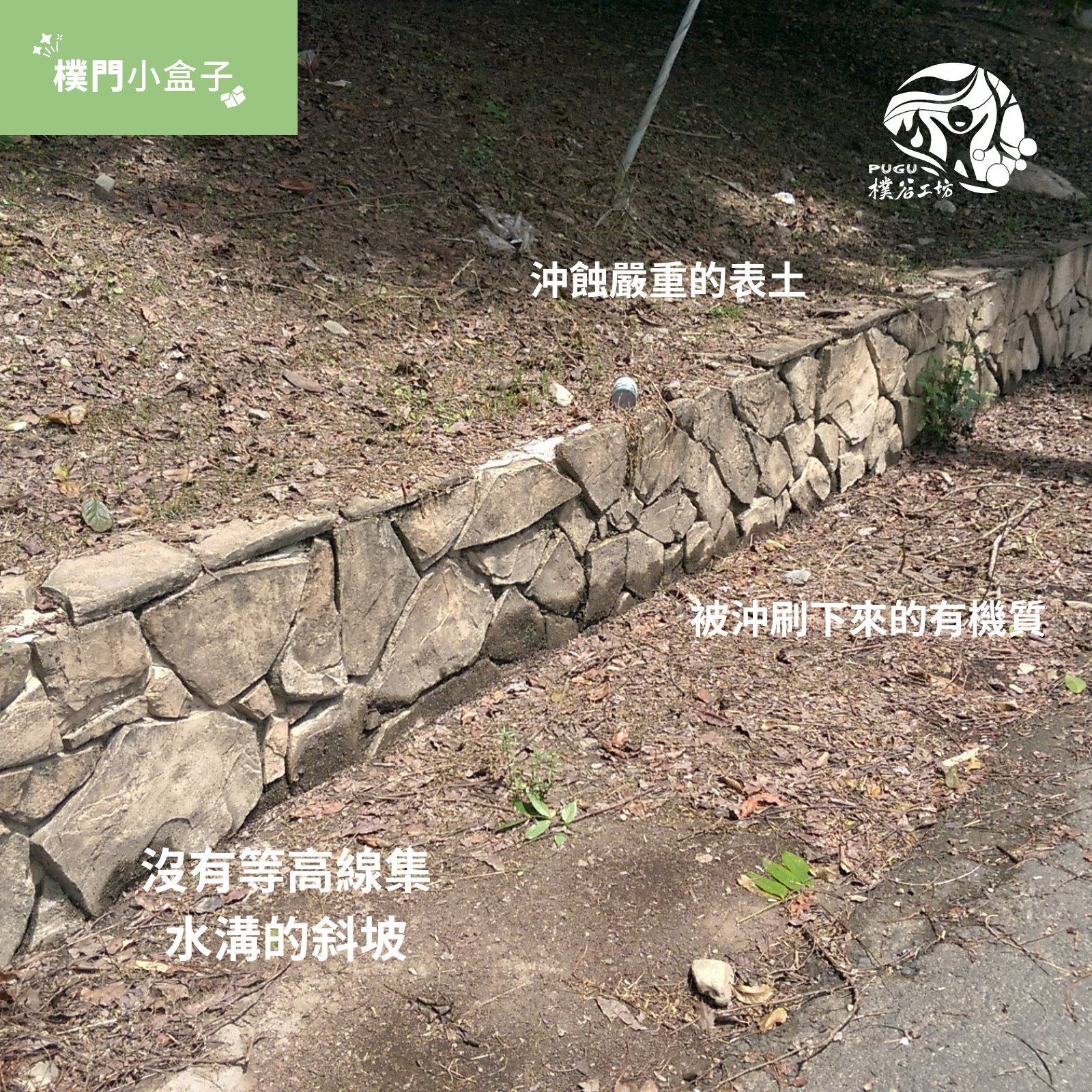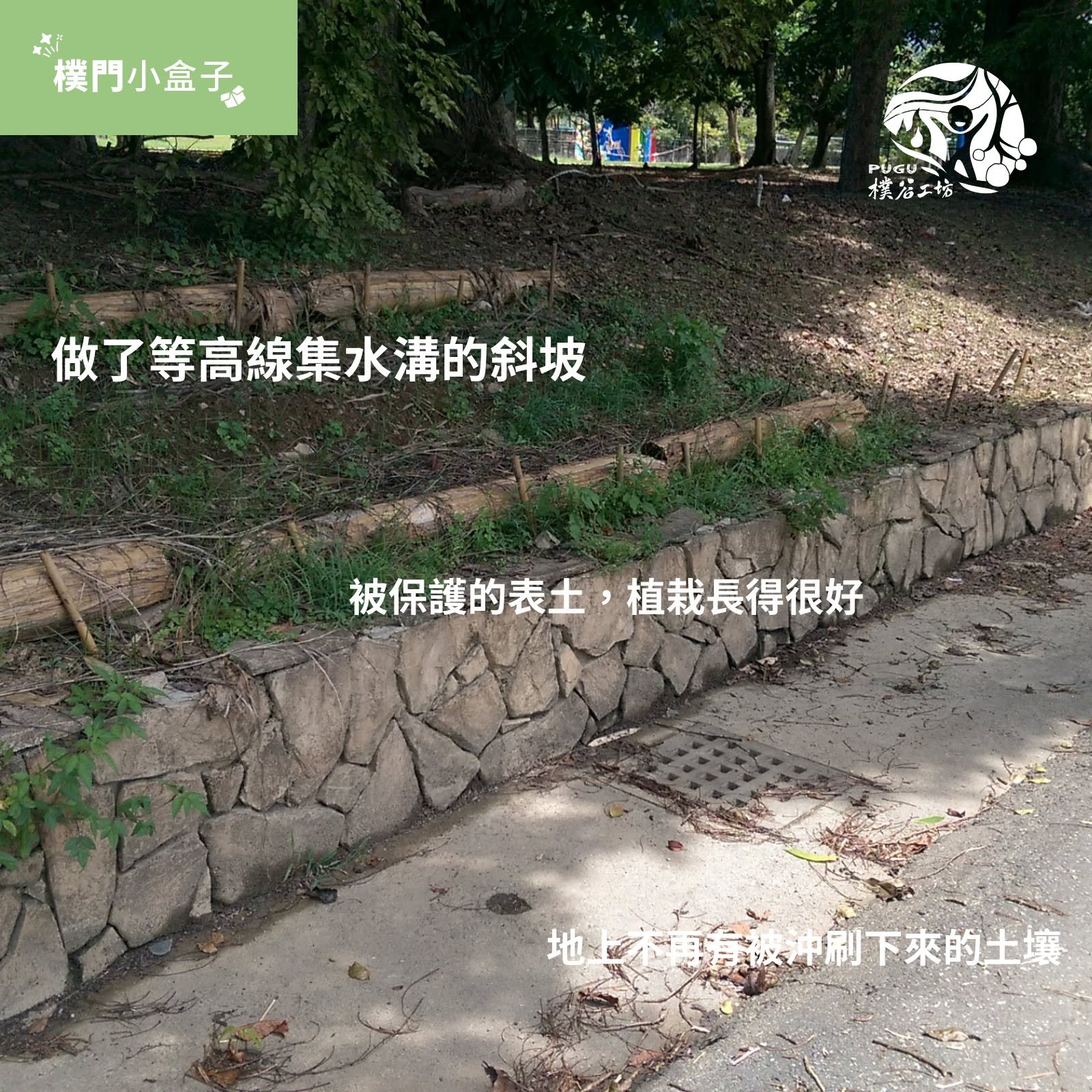 我們觀察水在陡坡上會不斷加速,越到下方速度越快,對土壤造成的侵蝕也越多。如果中間有一個平坦的地方,那麼水會先停下來,留在平地上休息一下,再重新向下流,有了中間的煞車,水的流速減慢,土壤的侵蝕就會減少了。
